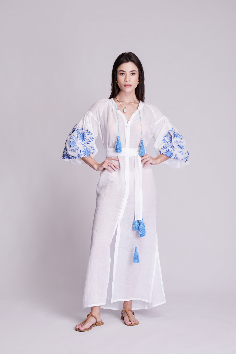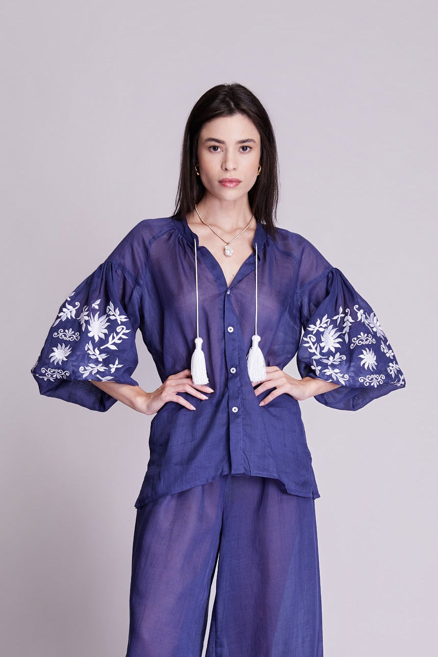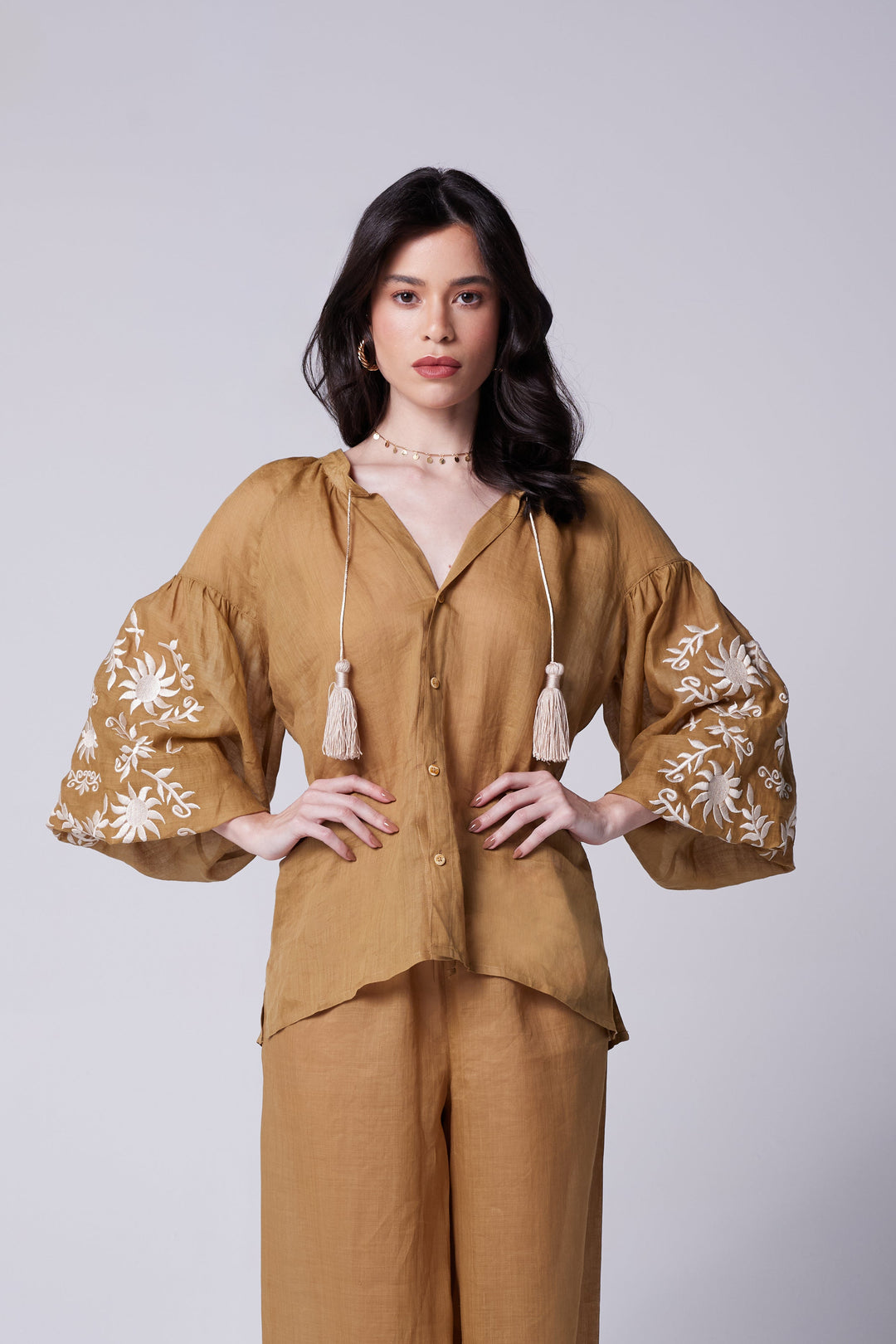 A Bata Brigite, confeccionada em gaze de linho, traduz a leveza e o trabalho artesanal característicos da Sohoostyle. O modelopossui abertura frontal por botões e mangas bufantes com punho ajustável, também finalizado por botões.