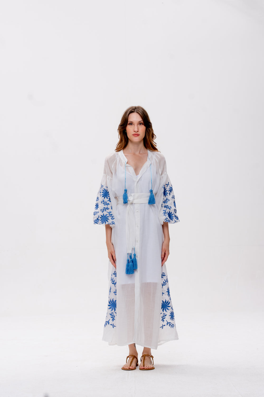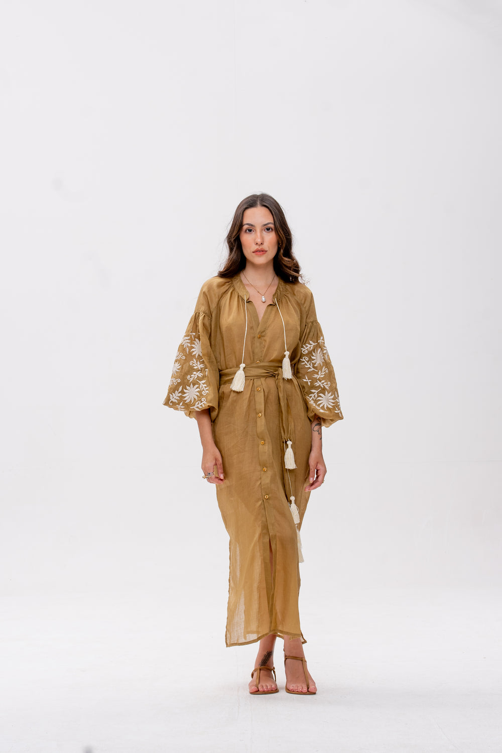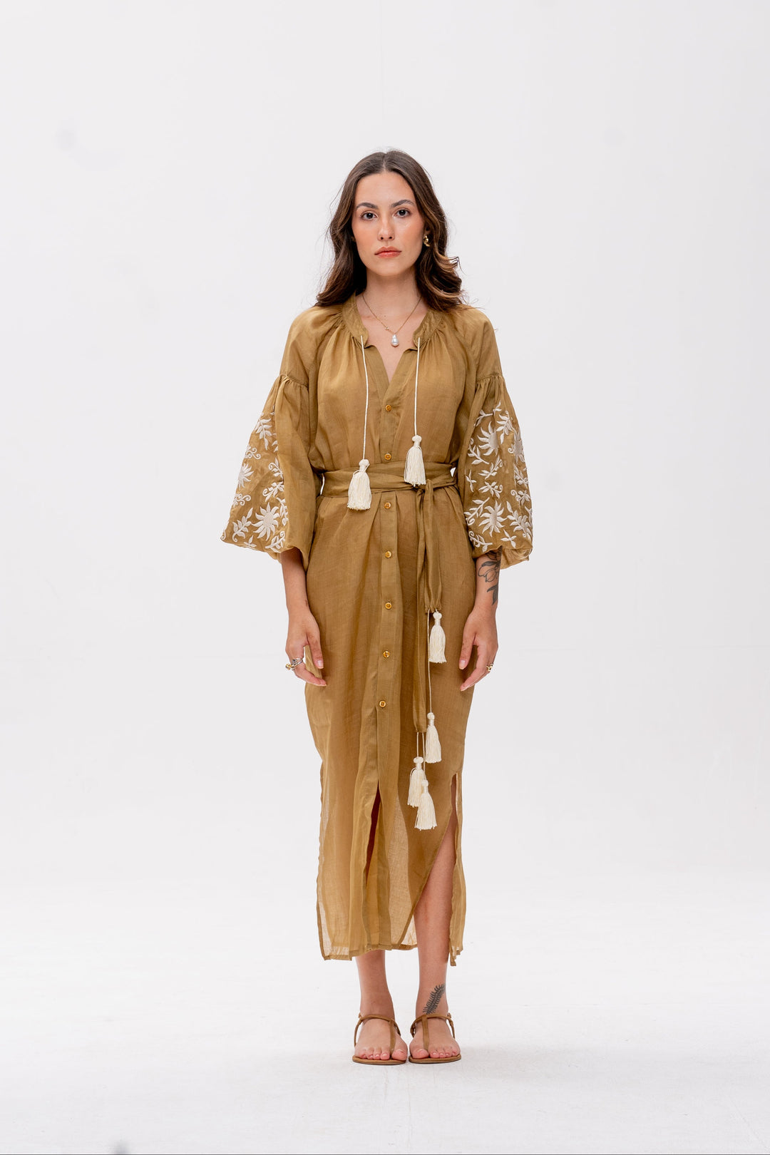 A Bata Brigite, confeccionada em gaze de linho, traduz a leveza e o trabalho artesanal característicos da Sohoostyle. O modelopossui abertura frontal por botões e mangas bufantes com punho ajustável, também finalizado por botões.