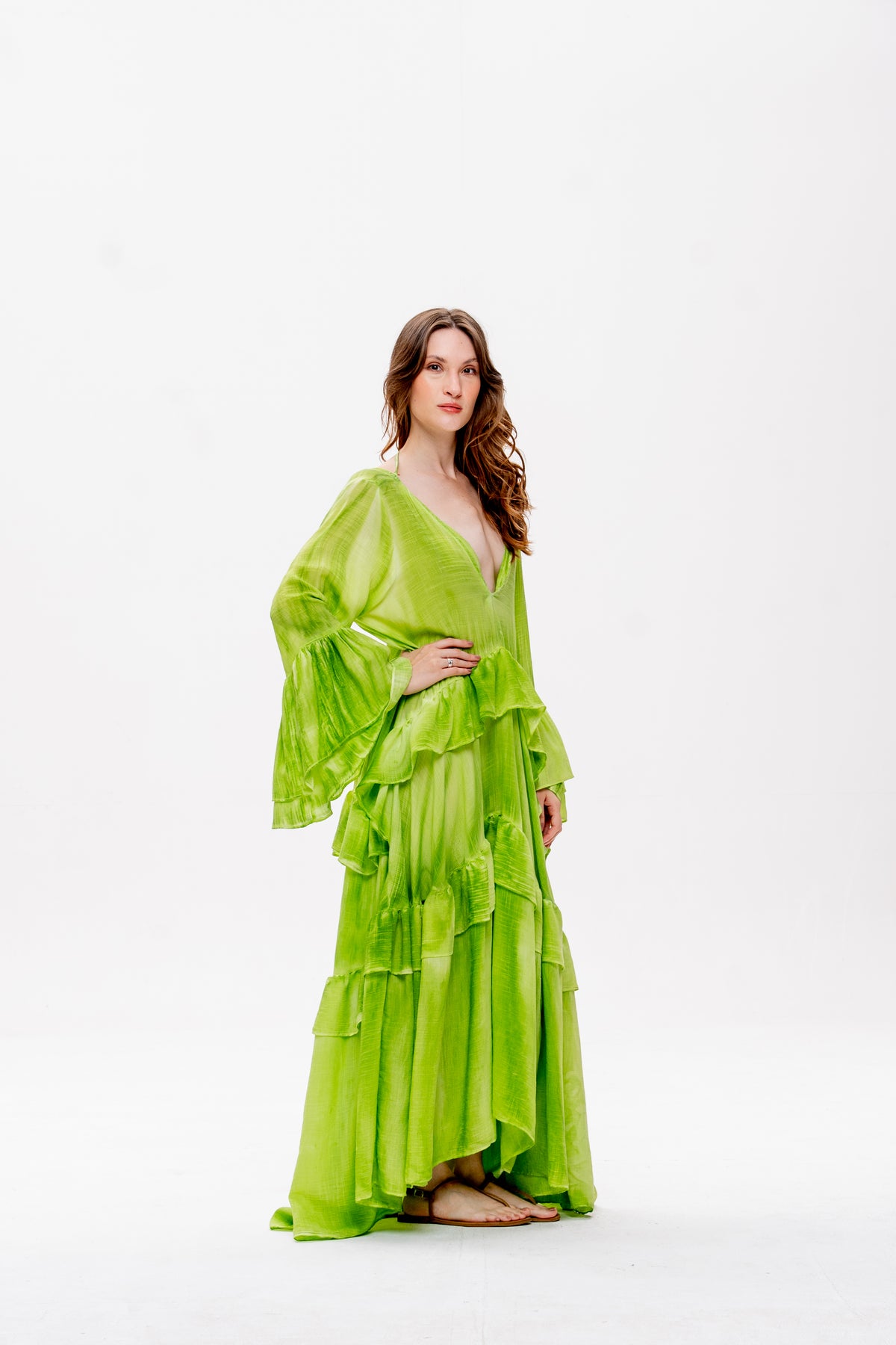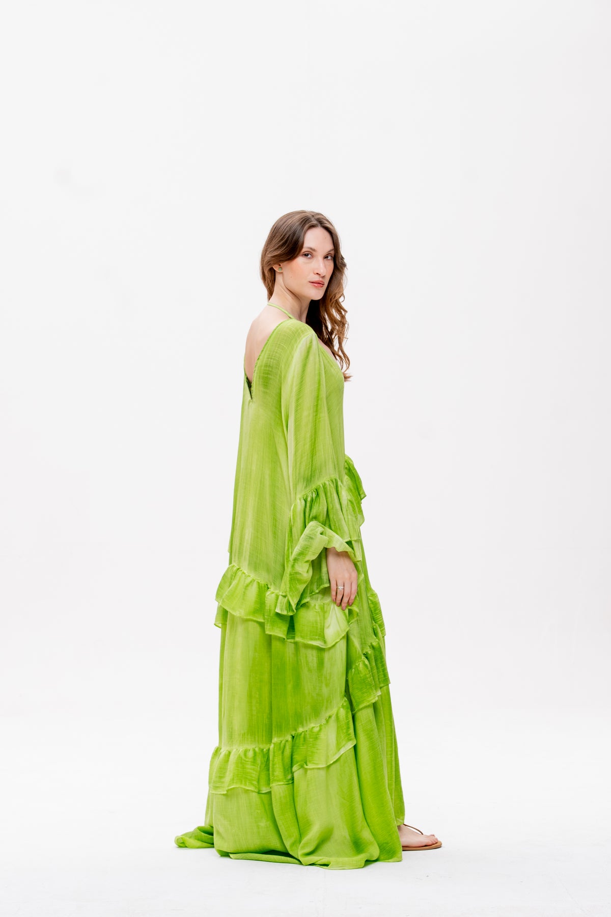 O tingimento manual na cor verde garante nuances únicas e acabamento artístico, valorizando o trabalho artesanal presente em cada peça. O decote em V equilibra delicadeza e leveza, harmonizando com a proposta fluida do modelo.