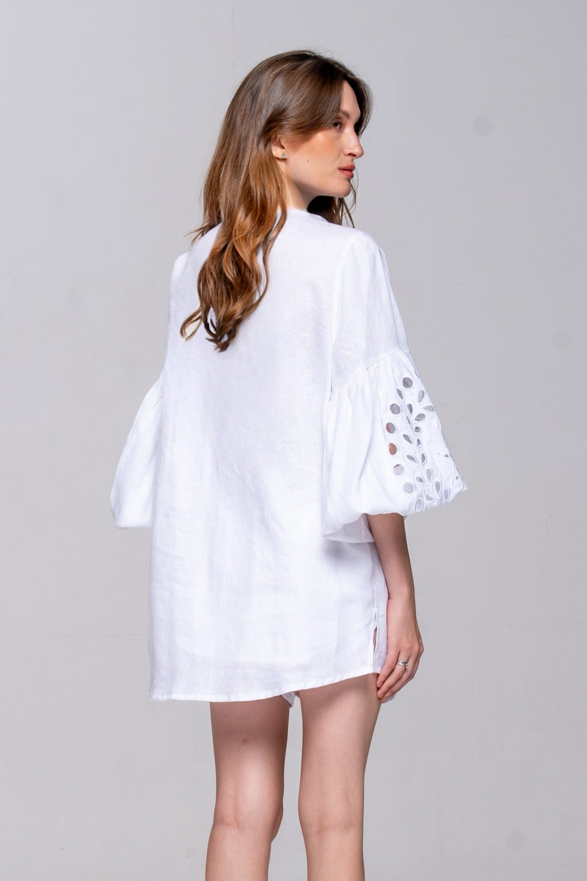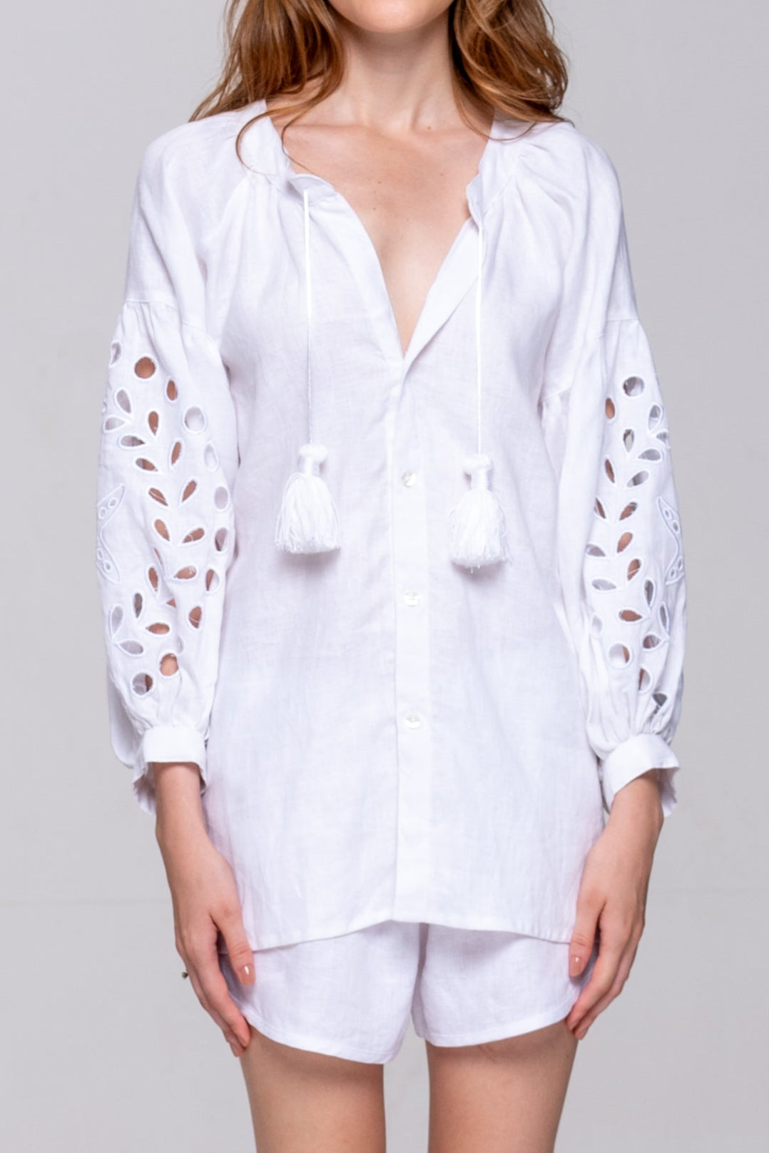 A peça é realçada por delicados bordados brancos richelieu, que ilustram uma estrela-do-mar, aplicados estrategicamente nas mangas bufantes, combinando com os tassels em branco da gola. Esta aplicação sutil cria um jogo de texturas e relevos que captura a luz com elegância. Os punhos em tecido com abotoadura oferecem um acabamento refinado.