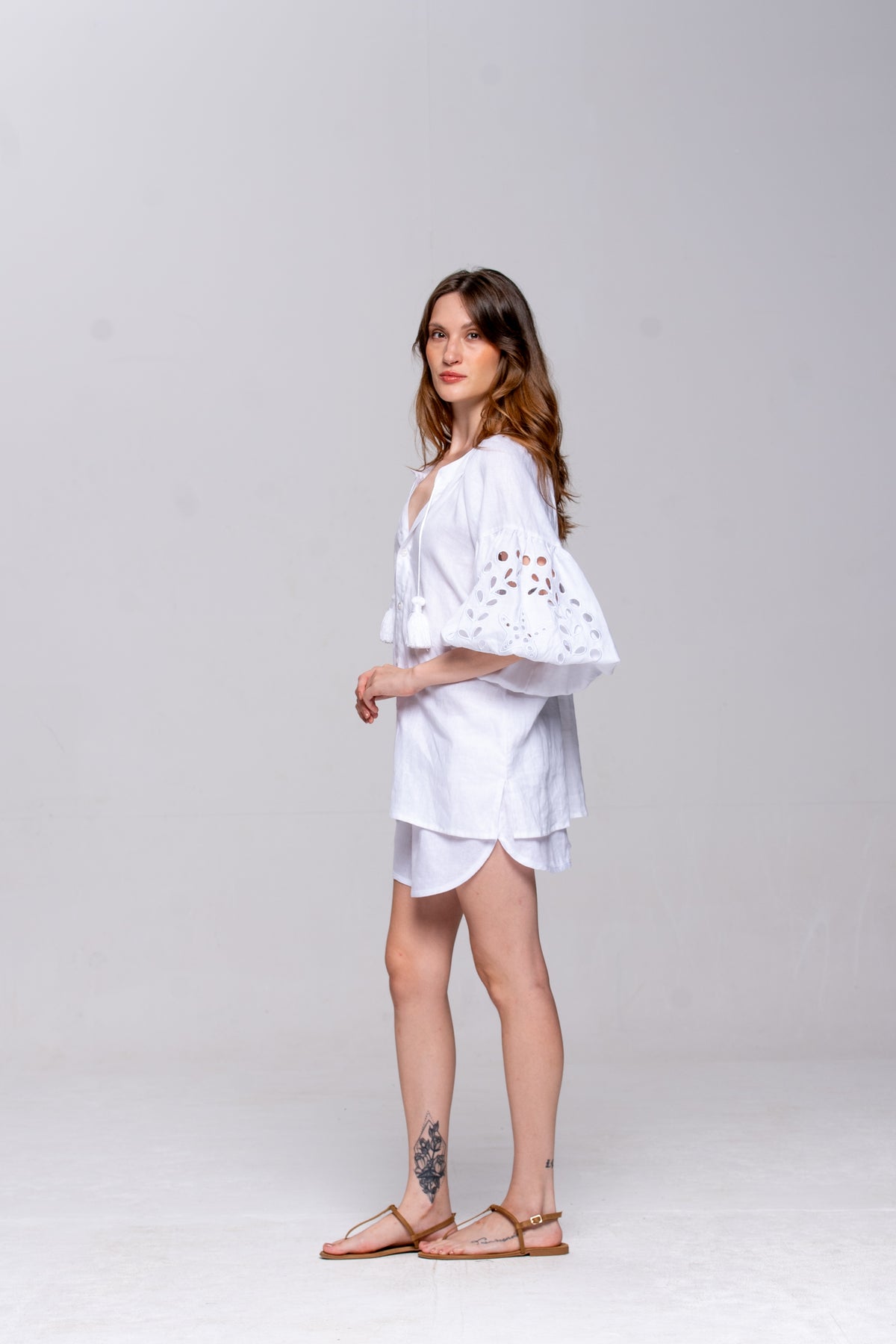 Com elegância minimalista e atemporal, a Bata Estrela do Mar em linho branco é um tributo à sofisticação sutil. Confeccionada com a modelagem orgânica característica da coleção, esta peça encanta pela sua pureza cromática e detalhes precisos que celebram a beleza marinha.
