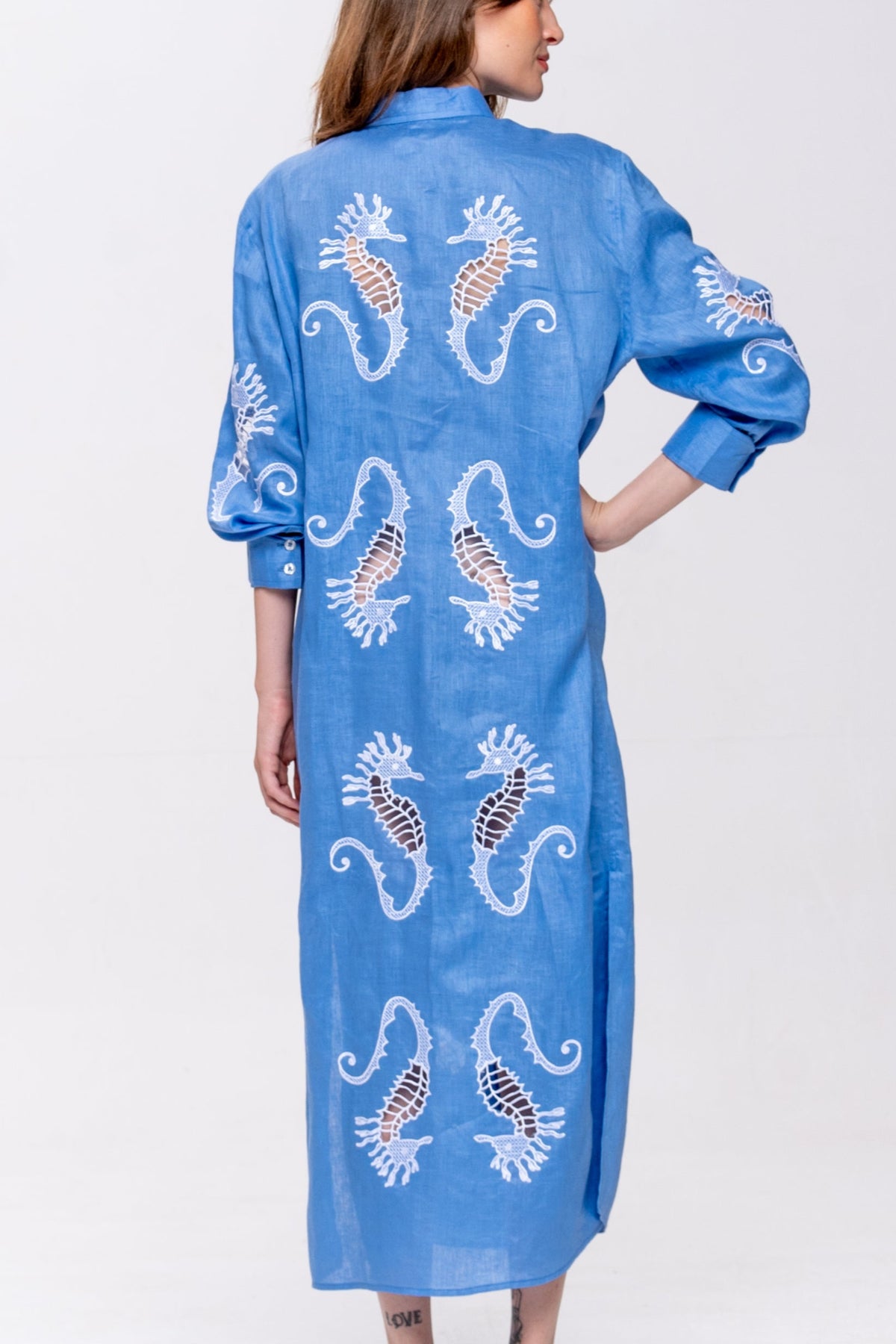Chemise Oceano Linho Bordado Cavalo Marinho