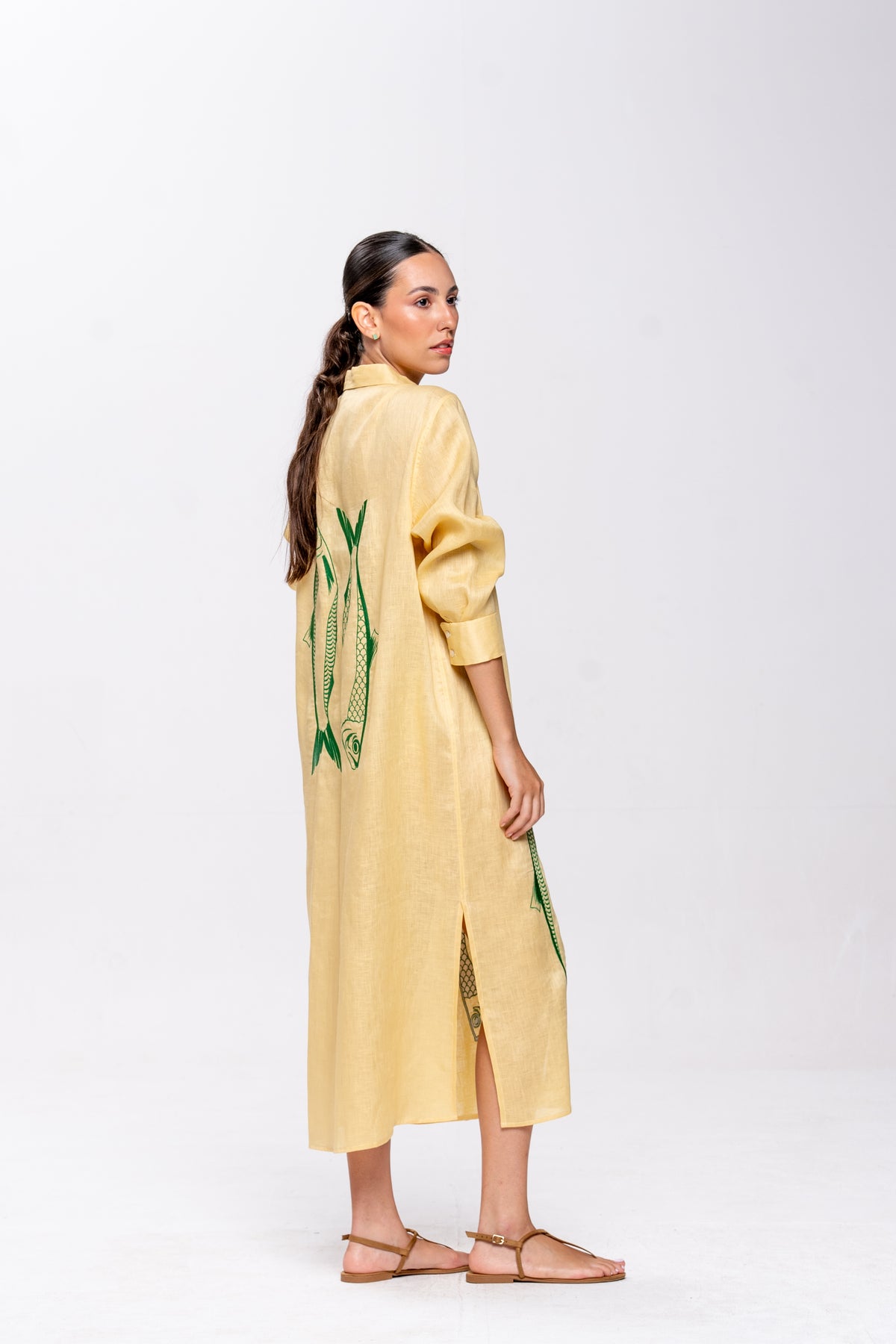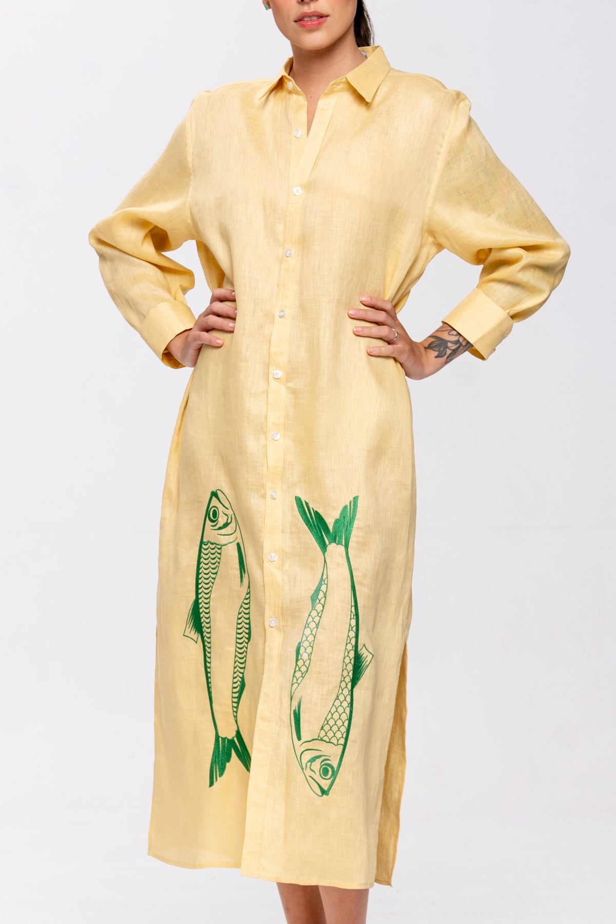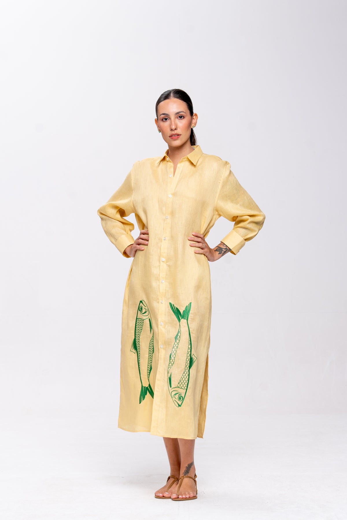 Elegante e fluida, a Chemise Sardinha em linho 100% na cor Amarelo Manteiga é uma peça que une a sofisticação atemporal à identidade única da coleção. Com modelagem ampla e comprida, oferece conforto e versatilidade para diversas ocasiões, mantendo um ar refinado e descontraído.