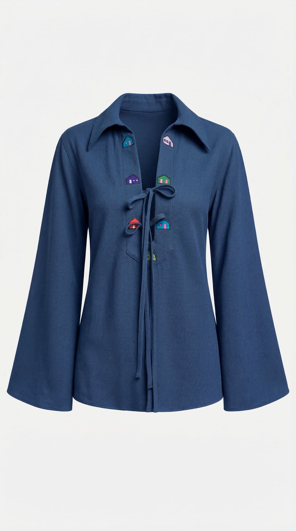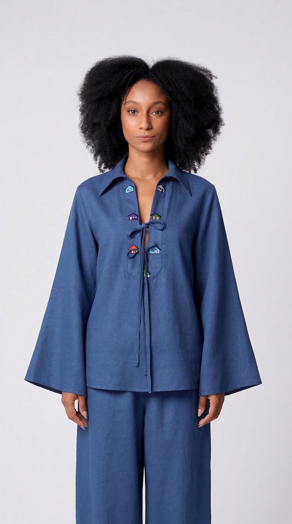 O movimento das mangas amplas confere uma aura de serenidade, enquanto o decote profundo serve como a tela perfeita para o detalhe mais encantador da peça: uma sequência de casinhas bordadas em cores vibrantes que evocam o cotidiano trancosiano. Finalizada com laços delicados, a peça pontua o visual com um toque lúdico.