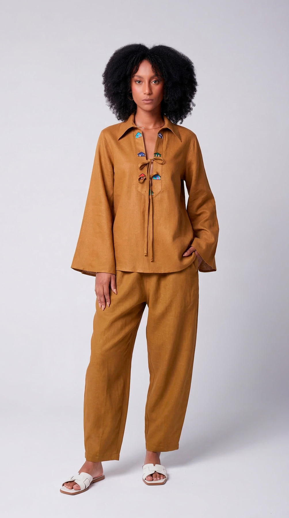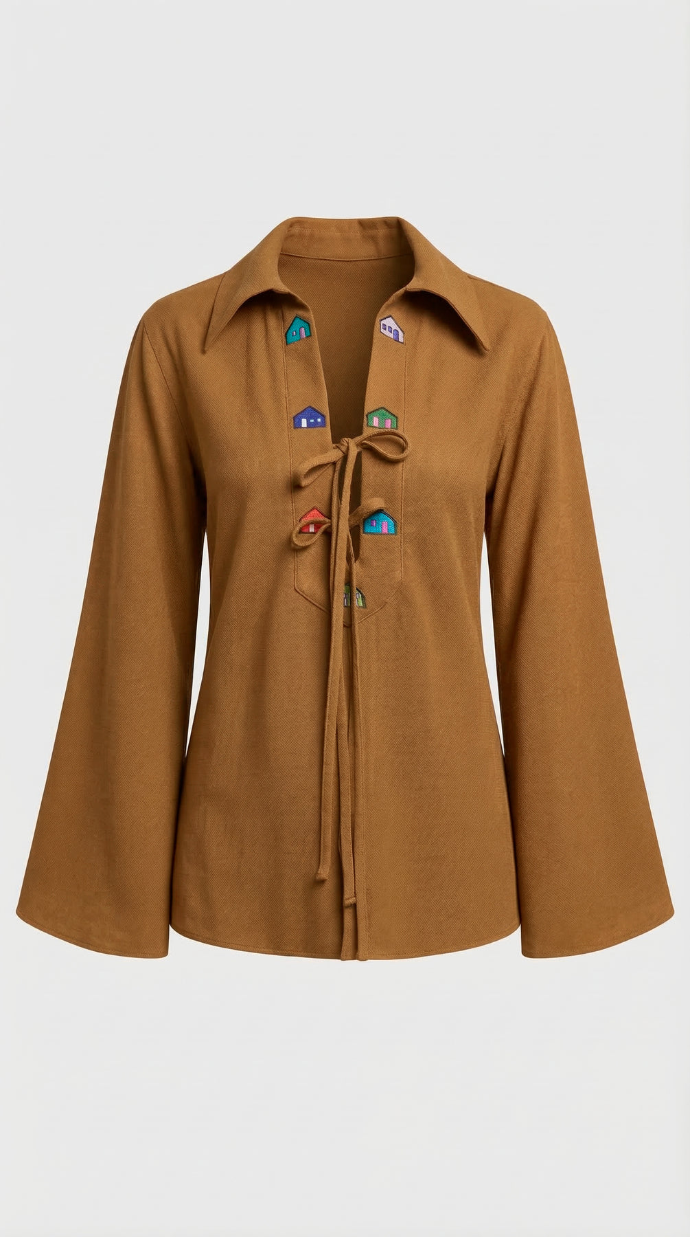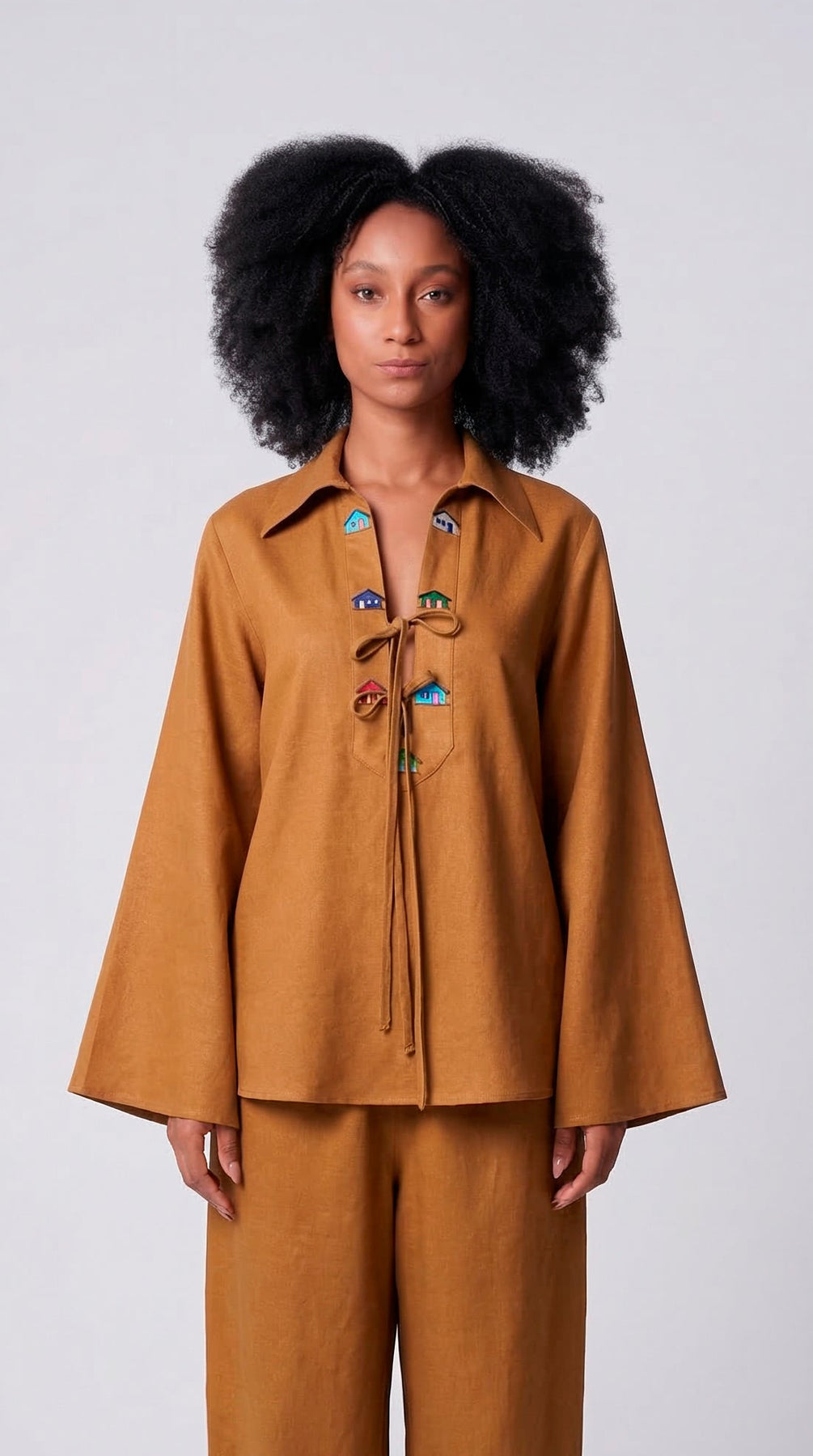 O movimento das mangas amplas confere uma aura de serenidade, enquanto o decote profundo serve como a tela perfeita para o detalhe mais encantador da peça: uma sequência de casinhas bordadas em cores vibrantes que evocam o cotidiano trancosiano. Finalizada com laços delicados, a peça pontua o visual com um toque lúdico.