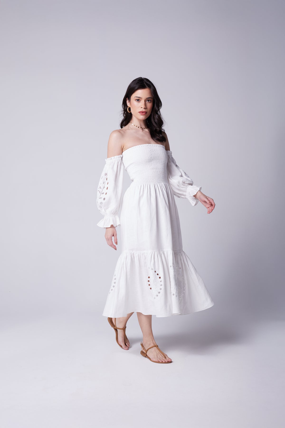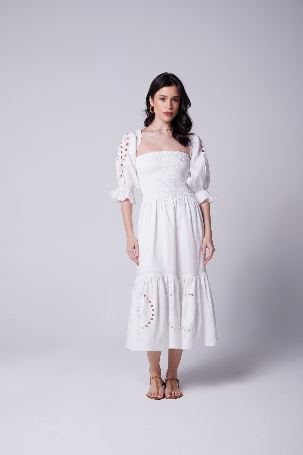 Puro e elegante, o Vestido Lastex Oceano é confeccionado em linho 100%, na tonalidade Branco, refletindo leveza e sofisticação natural.