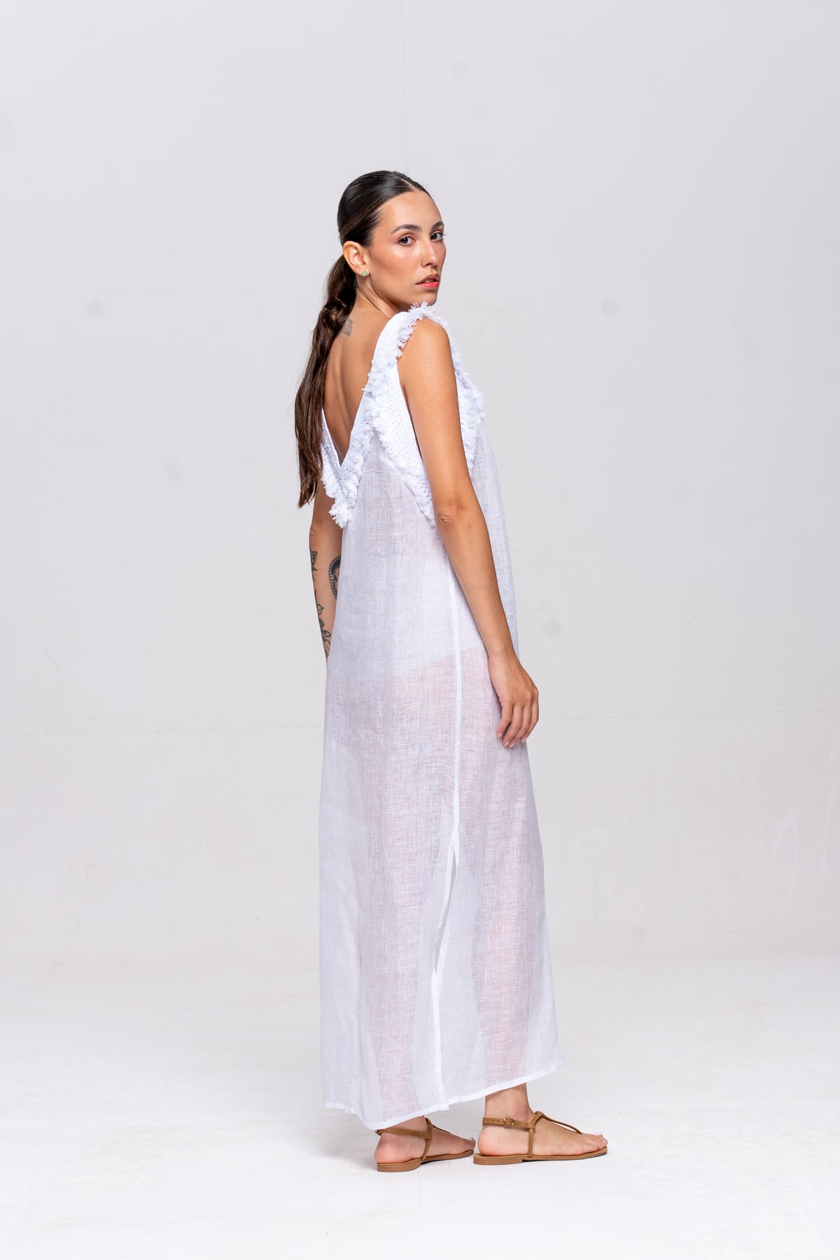 O Vestido Brigite de alça, confeccionado em gaze de linho, reflete a leveza e autenticidade características da Sohoostyle. O modelo apresenta decote em “V” tanto na frente quanto nas costas, com acabamento em franjas artesanais tingidas manualmente junto ao tecido, que valorizam a belaza da peça.