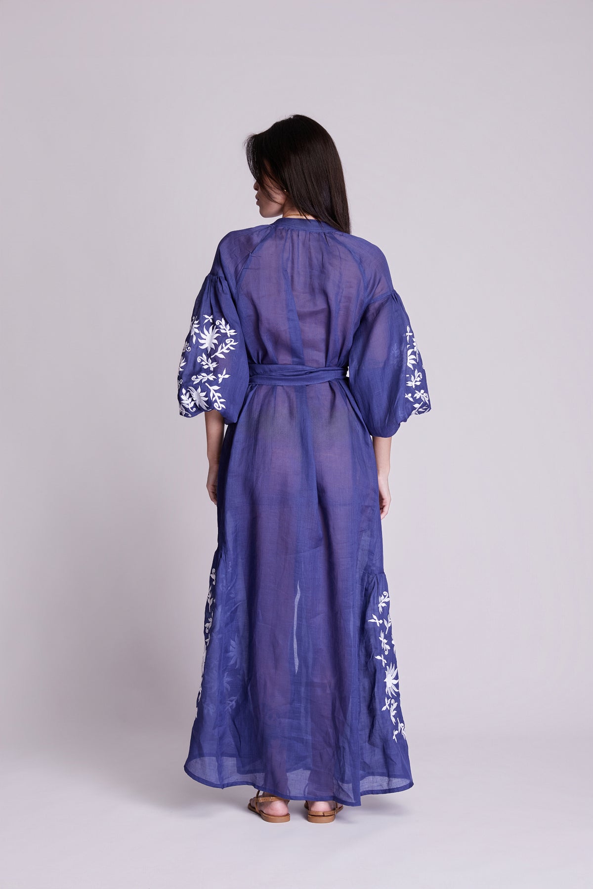 Vestido Afrodity confeccionado em rami, tecido de fibra natural com toque leve e estrutura sutil. Possui bordados localizados nas mangas e nas nesgas, valorizando o trabalho artesanal da peça.