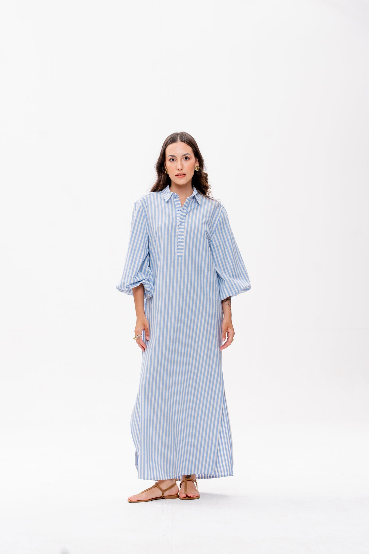 A Chemise Longa Maré Alta, em 100% algodão azul listrado, possui caimento reto e fluido, ressaltando a elegância natural da peça. As mangas ¾ levemente bufantes conferem um volume delicado, enquanto o colarinho com botões adiciona sofisticação atemporal.