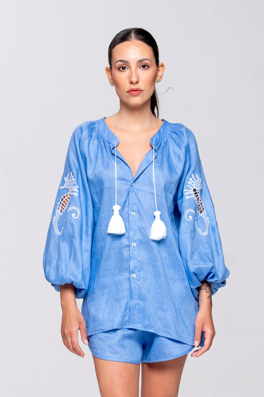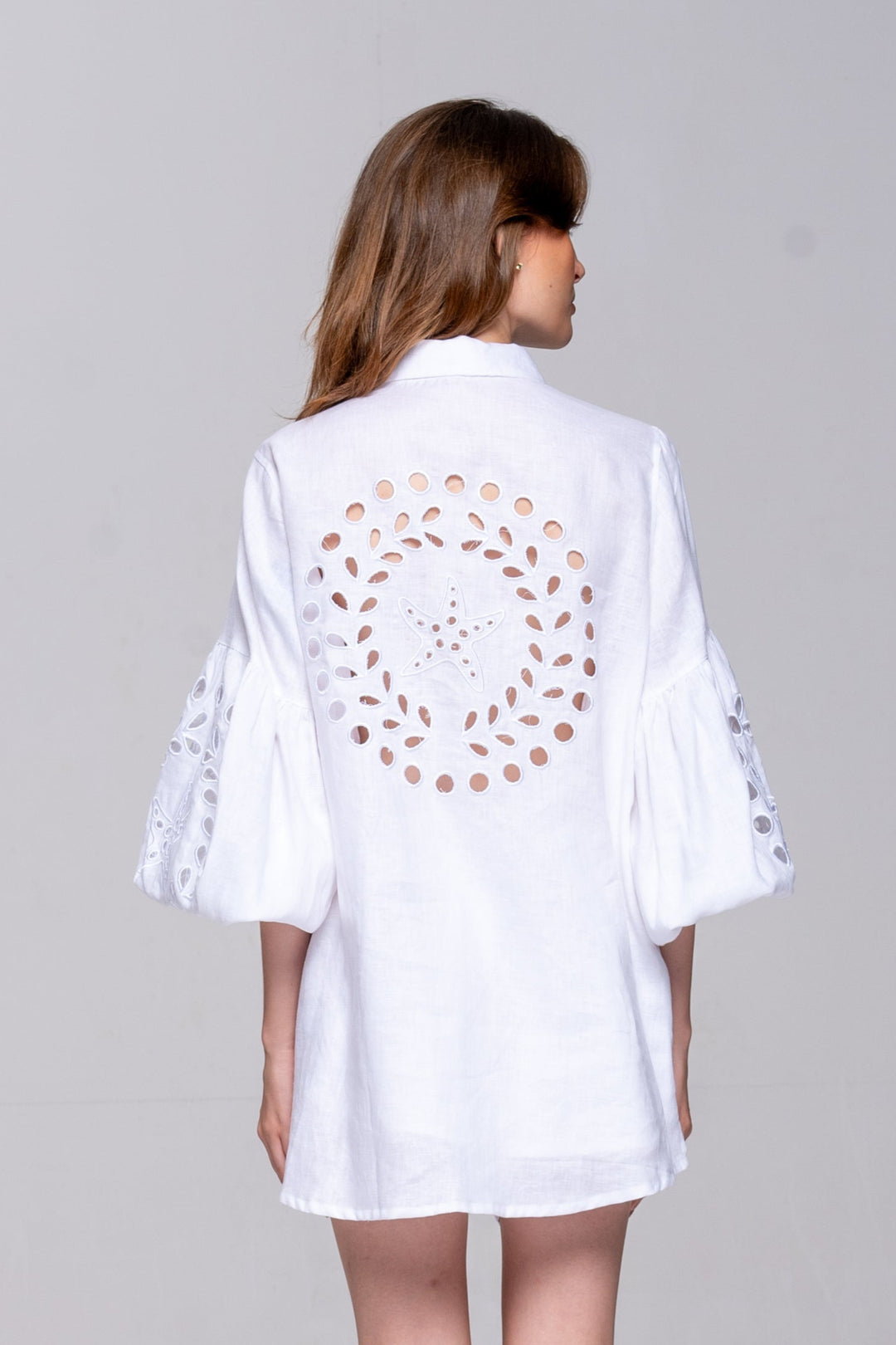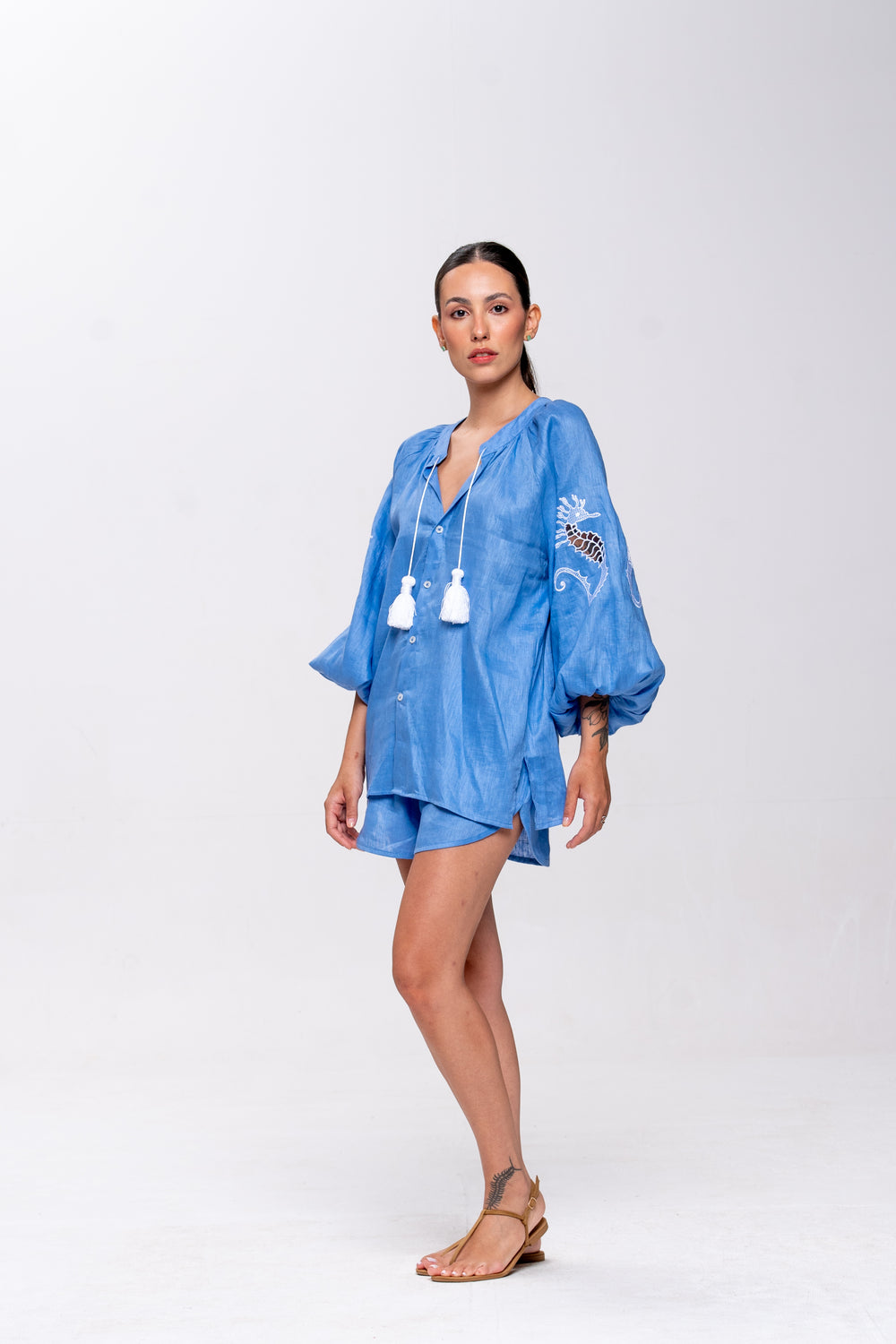 Made from 100% linen gauze, hand-dyed and with original embroidery. Light and versatile, it goes beyond just clothing; it is an accessory that adds charm and personality to any look.