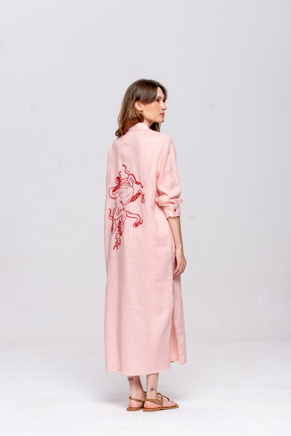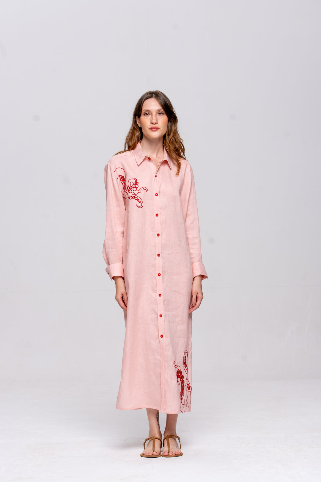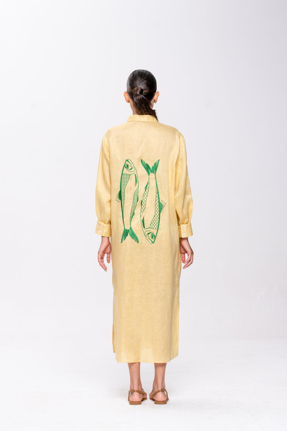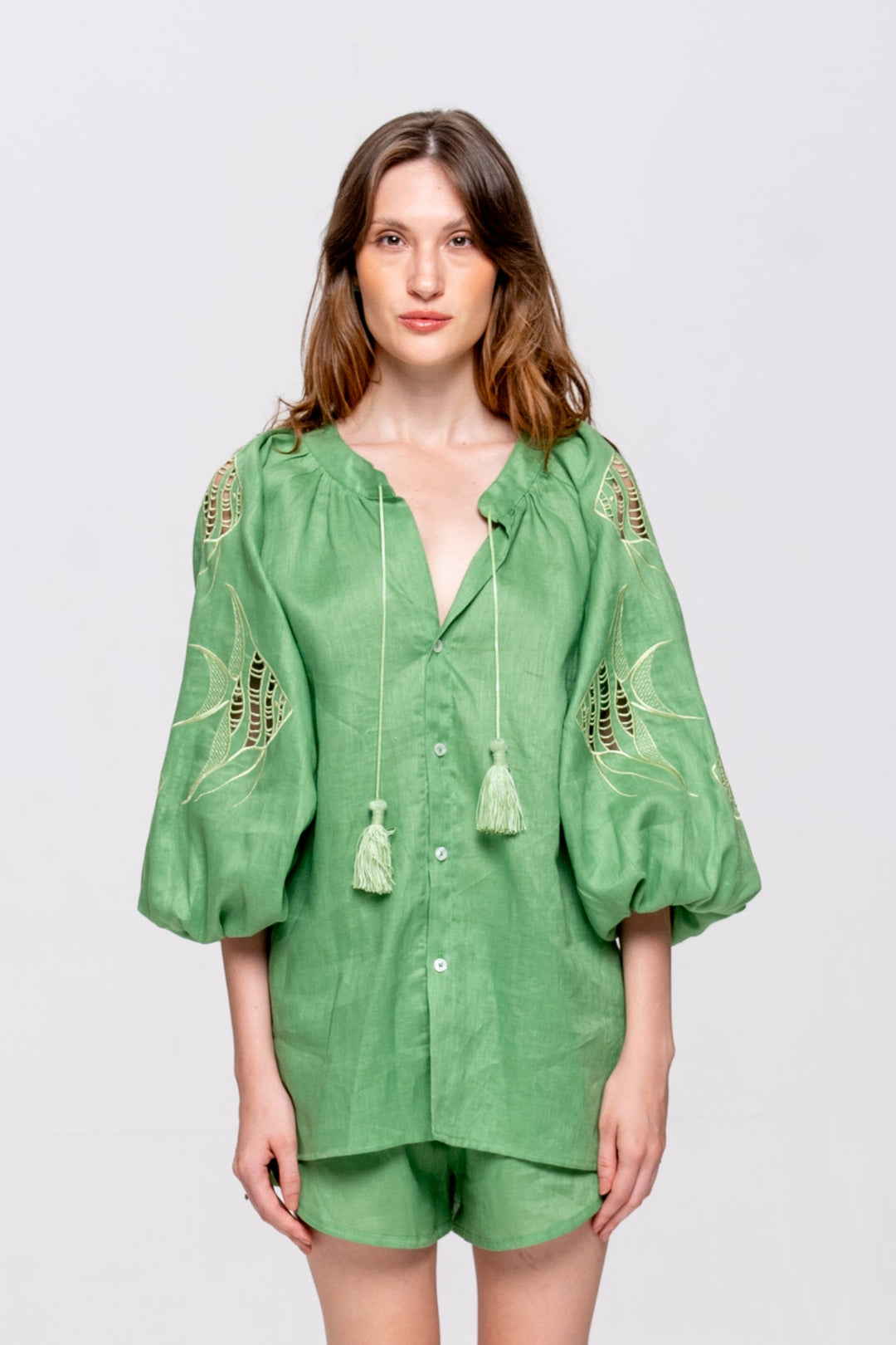 Made from 100% linen gauze, hand-dyed and with original embroidery. Light and versatile, it goes beyond just clothing; it is an accessory that adds charm and personality to any look.