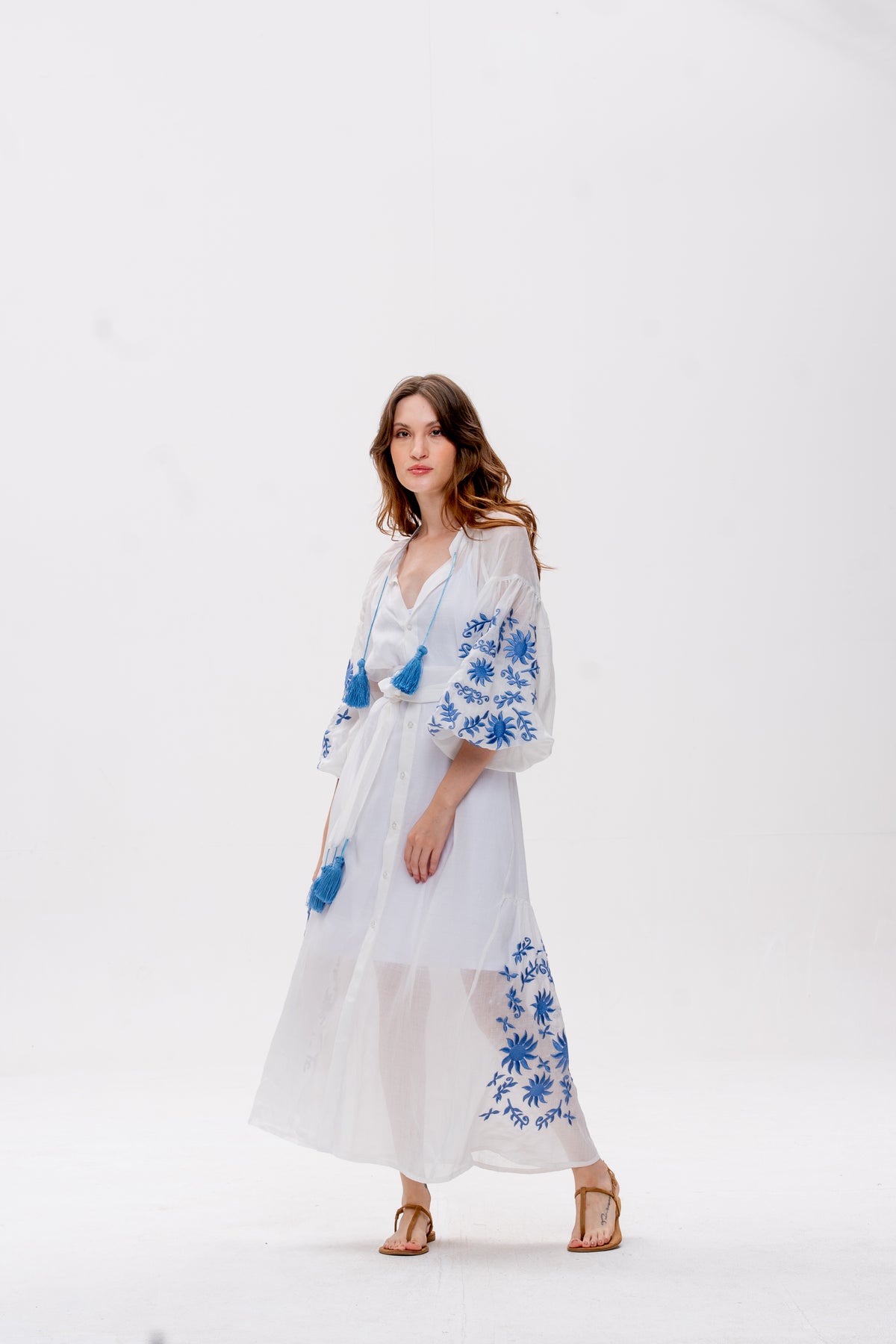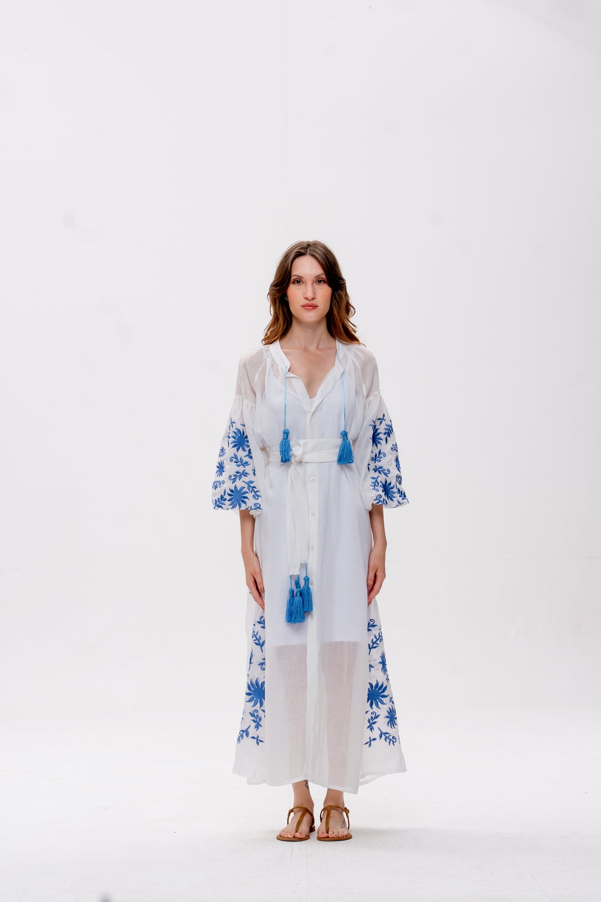 Vestido Afrodity confeccionado em rami, tecido de fibra natural com toque leve e estrutura sutil. Possui bordados localizados nas mangas e nas nesgas, valorizando o trabalho artesanal da peça.