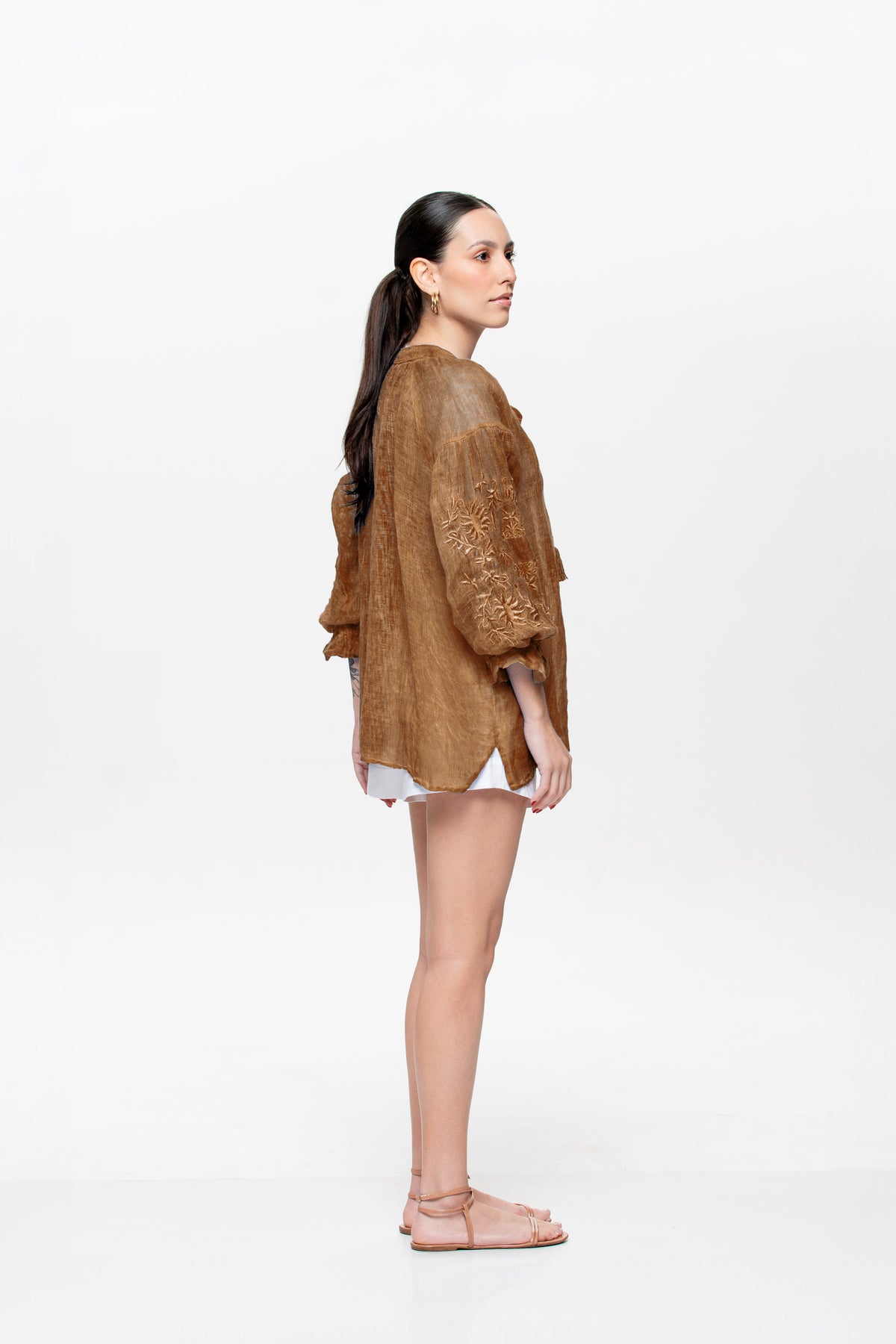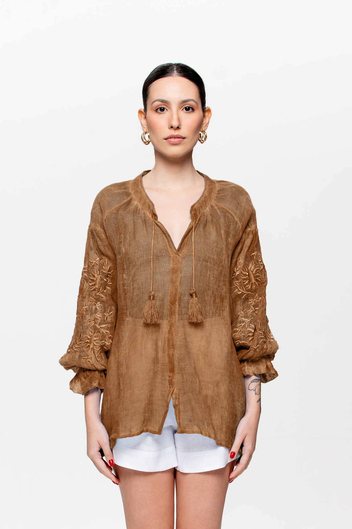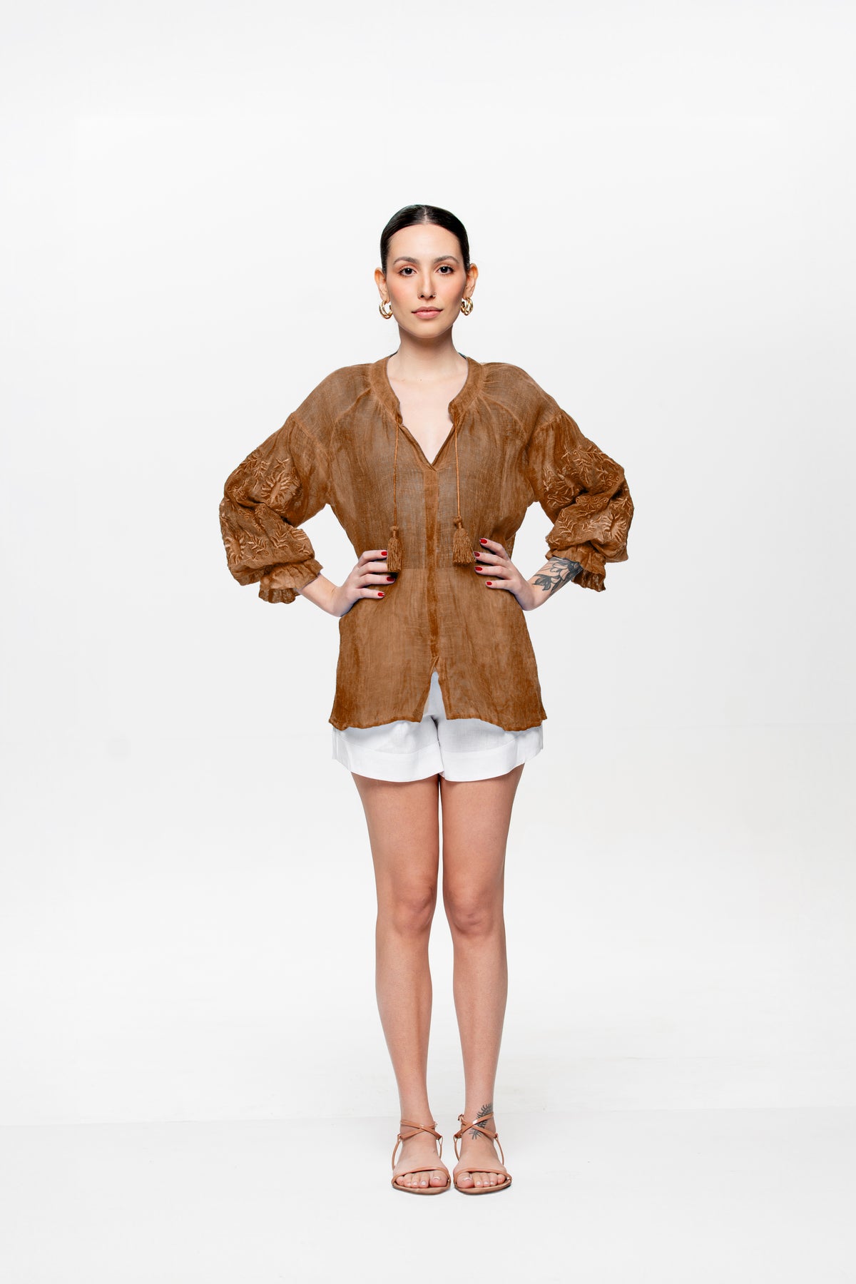 With a light and relaxed design, the Valentina Blouse is the ideal piece to create sophisticated and comfortable looks. Made from high-quality linen gauze , it features detailed embroidery on the sleeves, which adds a modern and unique touch.