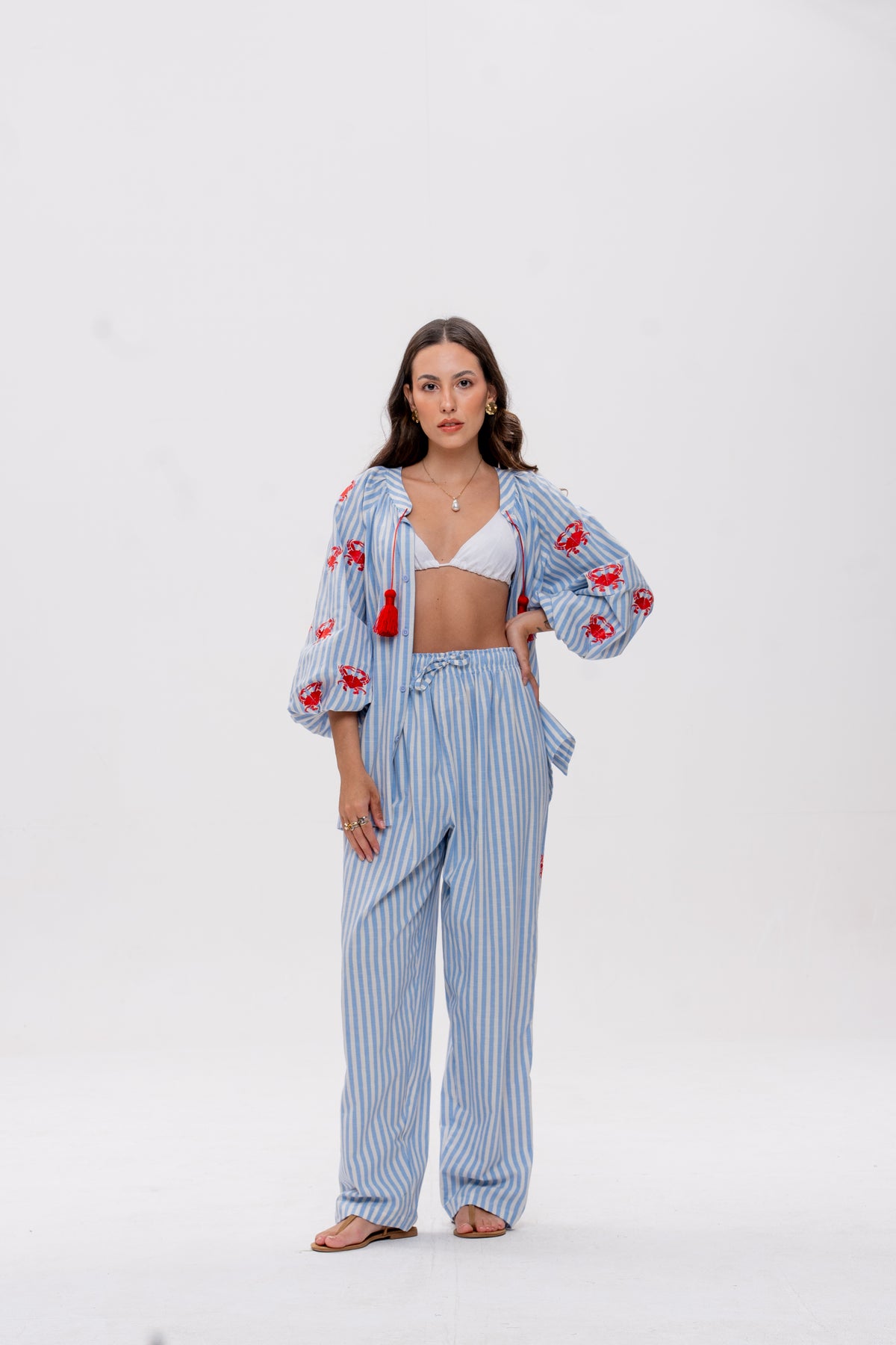 Calça em modelagem pijama, reta e contemporânea, confeccionada em 100% algodão azul listrado. O cós em elástico garante conforto, enquanto os bordados de caranguejo que percorrem a lateral trazem leveza, criatividade e charme à peça.