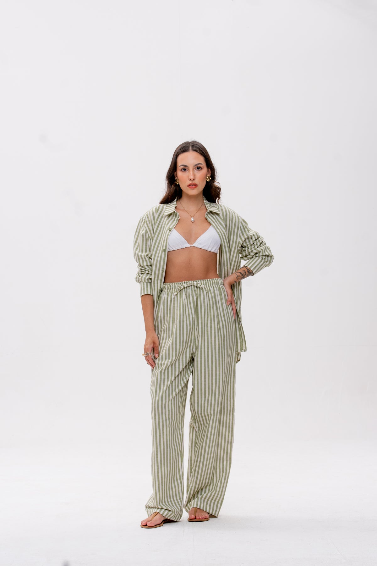 Calça em modelagem pijama, reta e contemporânea, confeccionada em 100% algodão verde listrado. O cós em elástico garante conforto, enquanto os bordados de caranguejo que percorrem a lateral trazem leveza, criatividade e charme à peça.
